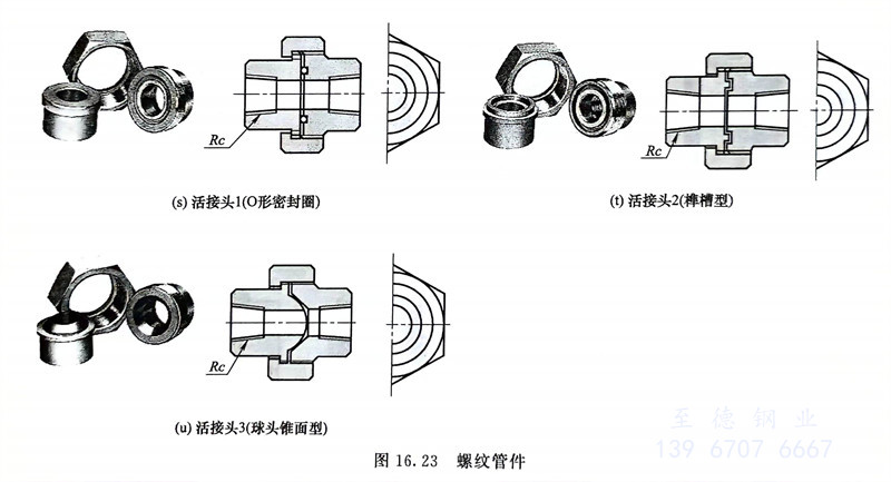 常(chang)用(yong)的管(guan)件中,螺紋短節(jie)為外(wai)螺紋,而彎頭(tou)、三(san)通(tong)、管(guan)帽、活(huo)接頭(tou)等多(duo)為內螺紋,如圖(tu)16.23所(suo)示(shi),使用(yong)時應(ying)注意它們之間的搭配和組合。