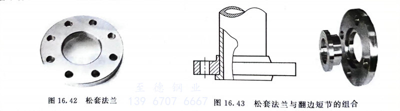 常用于(yu)介(jie)質溫度和壓(ya)力都不(bu)高而介(jie)質腐蝕性較(jiao)強的(de)(de)情況(kuang)。松套法(fa)蘭一(yi)般與(yu)翻(fan)(fan)邊(bian)(bian)短(duan)節(jie)(jie)組(zu)合使(shi)用(圖16.43),即將法(fa)蘭圈(quan)松套在翻(fan)(fan)邊(bian)(bian)短(duan)節(jie)(jie)外,管(guan)子與(yu)翻(fan)(fan)邊(bian)(bian)短(duan)節(jie)(jie)對焊(han)(han)連接,法(fa)蘭密封面(凹(ao)凸(tu)面、榫槽面除外)加工(gong)在翻(fan)(fan)邊(bian)(bian)短(duan)節(jie)(jie)上。此(ci)外,還有(you)平焊(han)(han)環和對焊(han)(han)環板式松套法(fa)蘭。由于(yu)法(fa)蘭本身不(bu)與(yu)介(jie)質相接觸,只(zhi)要求翻(fan)(fan)邊(bian)(bian)短(duan)節(jie)(jie)或焊(han)(han)環與(yu)管(guan)材一(yi)致,法(fa)蘭本體的(de)(de)材質完全可與(yu)管(guan)材不(bu)同,因而尤其適用于(yu)腐蝕性介(jie)質管(guan)道上,可以(yi)節(jie)(jie)省不(bu)銹鋼(gang)、有(you)色金屬等貴重耐蝕材料。
