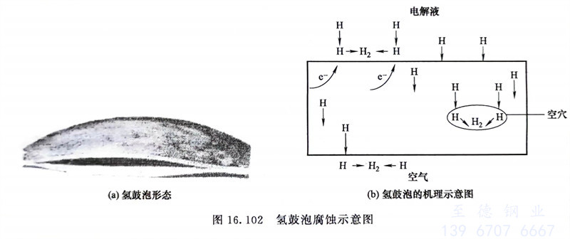 是指金屬材料中由于氫的存在或氫與金屬相互作用,造成材料力學性能下降的總稱。在含硫化氫的油、氣輸送管線及煉油廠設備常發生這種腐蝕。氫損傷分為四種不同的類型:氫鼓泡[圖16.102(a)]、氫脆(cui)、脫碳、氫蝕。氫鼓泡是指在某些介質中,由于腐蝕或其他原因而產生的氫原子滲入金屬,導致金屬局部變形,甚至完全破壞。氫脆是由于氫進入金屬內部,導致韌性和抗拉強度下降變脆,并在應力的作用下發生脆裂。脫碳即從鋼中脫出碳,常常是由于高溫氫蝕所引起的,導致鋼的抗拉強度下降。氫蝕是由于高溫下合金中組分與氫反應引起的。