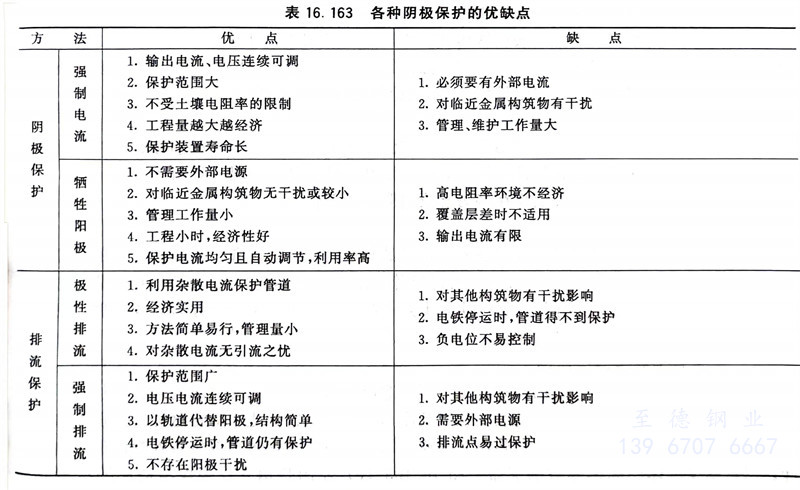 各種(zhong)陰(yin)極保護(hu)的優缺(que)點(dian)見表(biao)16.163。
