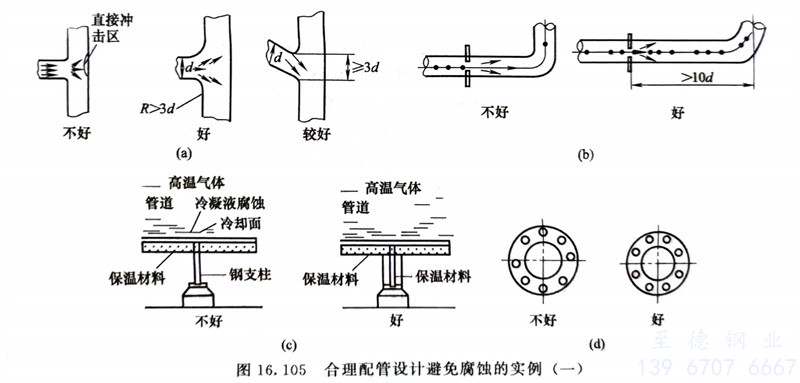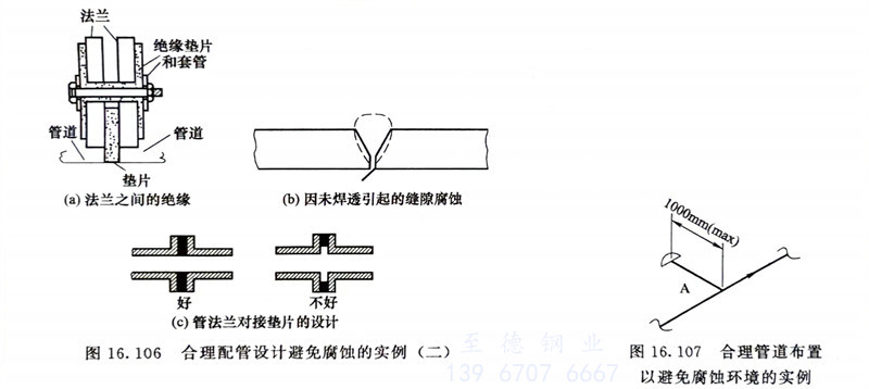 在(zai)設(she)計時(shi),為避(bi)免(mian)不(bu)合(he)(he)適(shi)的(de)流(liu)動狀態對管(guan)(guan)(guan)道(dao)造(zao)(zao)成(cheng)磨(mo)損腐蝕,通常要(yao)求流(liu)動狀態均(jun)勻,為避(bi)免(mian)流(liu)體(ti)通路(lu)斷面(mian)(mian)的(de)急劇(ju)變化(hua)、不(bu)連續變化(hua)以(yi)及(ji)流(liu)動方向的(de)急劇(ju)變化(hua),應(ying)盡量抑制(zhi)流(liu)速差(cha)和(he)壓力(li)降,以(yi)免(mian)引(yin)起(qi)湍流(liu)和(he)渦流(liu)。管(guan)(guan)(guan)道(dao)在(zai)轉彎及(ji)三通處以(yi)及(ji)孔板流(liu)量計的(de)安(an)放位(wei)置(zhi)處都應(ying)進(jin)行合(he)(he)理設(she)計,盡量減少流(liu)體(ti)中固體(ti)顆粒(li)的(de)夾帶。圖(tu)(tu)16.105(c)左圖(tu)(tu)是(shi)鋼支(zhi)柱未保溫(wen)造(zao)(zao)成(cheng)的(de)冷凝(ning)液腐蝕。對策(ce)是(shi)將(jiang)鋼支(zhi)架一(yi)起(qi)保溫(wen),避(bi)免(mian)形成(cheng)冷凝(ning)液,見圖(tu)(tu)16.105(c)右圖(tu)(tu)。圖(tu)(tu)16.105(d)中螺栓不(bu)要(yao)設(she)置(zhi)在(zai)垂直方向的(de)最下方,以(yi)避(bi)免(mian)凝(ning)結(jie)水腐蝕螺栓。管(guan)(guan)(guan)道(dao)設(she)計時(shi),對于用(yong)在(zai)電解(jie)質溶(rong)液中的(de)管(guan)(guan)(guan)道(dao),應(ying)盡可能避(bi)免(mian)異種金屬(shu)(電位(wei)差(cha)超過50mV),管(guan)(guan)(guan)道(dao)直接組焊(han)(han)(han),否則會造(zao)(zao)成(cheng)電偶(ou)腐蝕,即(ji)在(zai)電位(wei)較負的(de)金屬(shu)側(ce)發生宏觀電池腐蝕。如(ru)必須采用(yong)不(bu)同(tong)金屬(shu)管(guan)(guan)(guan)道(dao)組合(he)(he)時(shi),則在(zai)設(she)計中要(yao)采取絕(jue)緣措(cuo)施,見圖(tu)(tu)16.106(a)。管(guan)(guan)(guan)道(dao)單面(mian)(mian)焊(han)(han)(han)接時(shi)焊(han)(han)(han)縫(feng)(feng)必須滿焊(han)(han)(han)和(he)焊(han)(han)(han)透,未焊(han)(han)(han)透不(bu)但影響(xiang)(xiang)強度,也(ye)因在(zai)管(guan)(guan)(guan)道(dao)內壁造(zao)(zao)成(cheng)縫(feng)(feng)隙(xi)(xi)(xi)見圖(tu)(tu)16.106(b),而(er)引(yin)起(qi)縫(feng)(feng)隙(xi)(xi)(xi)腐蝕。管(guan)(guan)(guan)法蘭對接時(shi),墊片的(de)內徑要(yao)盡量和(he)管(guan)(guan)(guan)道(dao)的(de)內徑相一(yi)致,見圖(tu)(tu)16.106(c)。墊片材(cai)料也(ye)會對縫(feng)(feng)隙(xi)(xi)(xi)腐蝕造(zao)(zao)成(cheng)影響(xiang)(xiang),一(yi)些纖維(wei)類的(de)材(cai)料,由于能滲(shen)入電解(jie)質溶(rong)液而(er)引(yin)起(qi)縫(feng)(feng)隙(xi)(xi)(xi)腐蝕。
