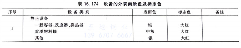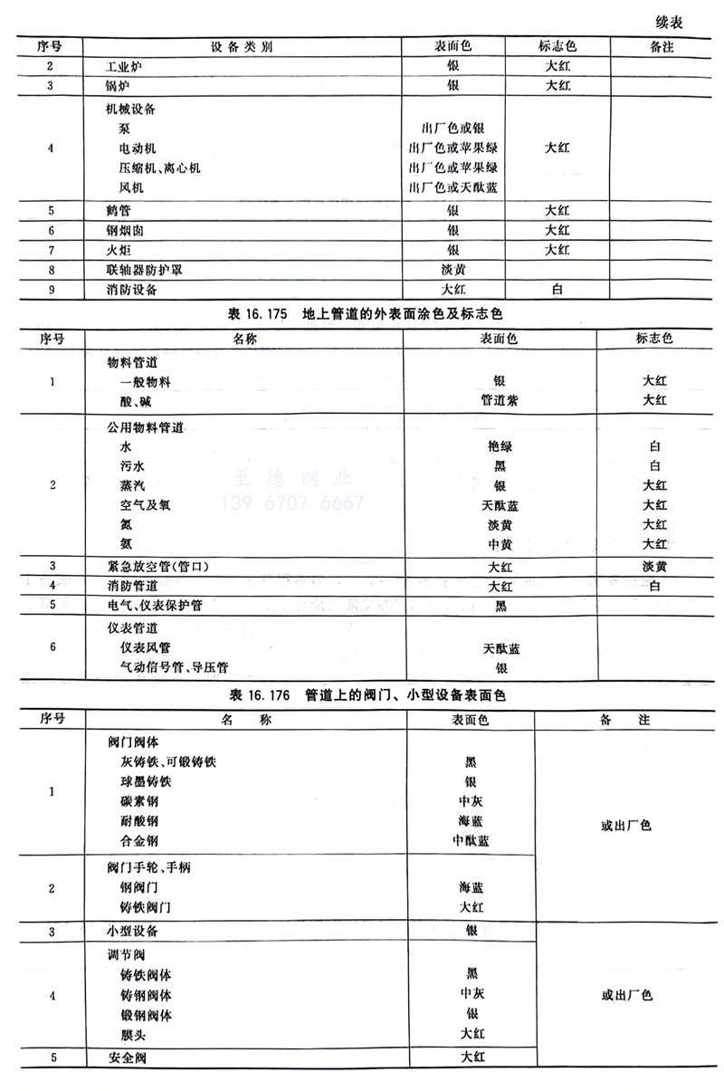 除非工(gong)程合同另(ling)有要求,用于管(guan)道的(de)顏(yan)色(se)(se)可按(an)相關的(de)標(biao)準、規范執行。SH 3043《石油化工(gong)企業設(she)備(bei)管(guan)道鋼結構表面色(se)(se)和標(biao)志規定(ding)》規定(ding)的(de)涂色(se)(se)及(ji)標(biao)志色(se)(se)。見表16.174~表16.176。