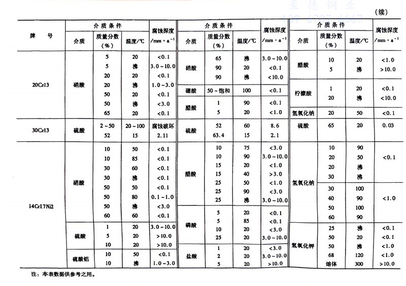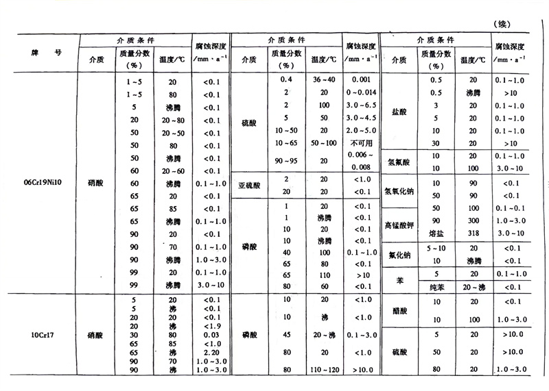 各種牌號不銹鋼在不同工況環(huan)境下,耐硫酸(suan)(suan)、磷酸(suan)(suan)、硝酸(suan)(suan)、鹽酸(suan)(suan)、醋酸(suan)(suan)、氫氟酸(suan)(suan)溶(rong)液腐蝕性能參照表