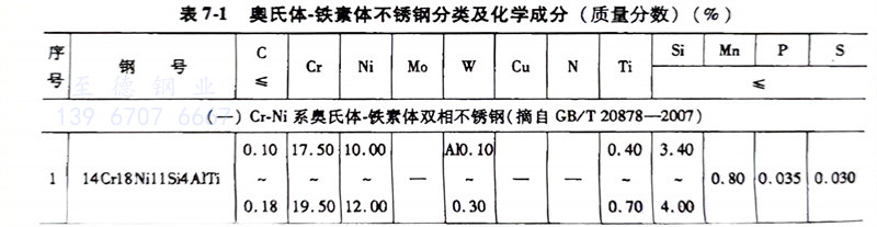奧氏體(ti)-鐵素體(ti)雙相(xiang)不銹鋼的分(fen)類及化(hua)學(xue)成分(fen)見表7-1