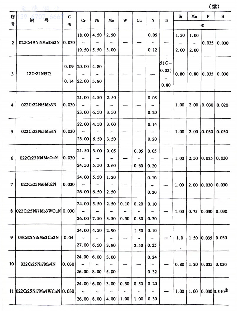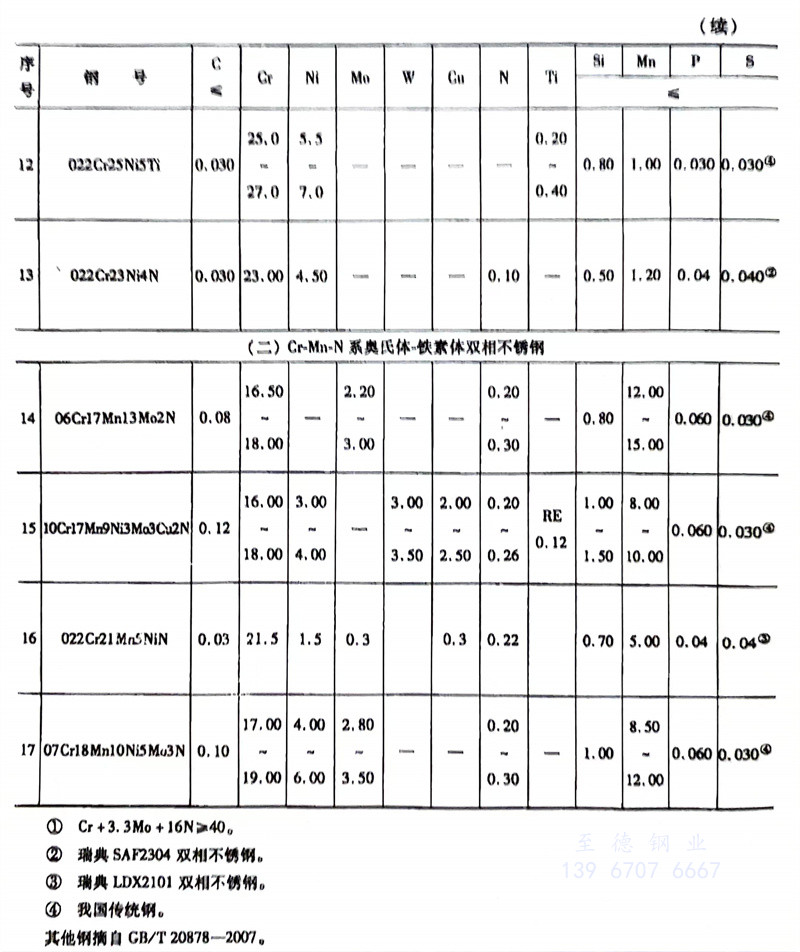 這類(lei)鋼(gang)按照(zhao)鉻(ge)含量(liang)的多少為Cr18型(xing): 如 14Cr18NillSi4AlTi、 022Cr19Ni5Mo3Si2N; Cr22型(xing):如12Cr21Ni5Ti、022Cr22Ni5Mo3N、022Cr23Ni5Mo3N、022Cr23Ni4MoCuN;以及Cr25型(xing):如022Cr25Ni6 Mo2N、022Cr25Ni7Mo3 WCuN、03Cr25Ni6Mo3Cu2N、022Cr25Ni7 Mo4N、022Cr25Ni7 Mo4WCuN鋼(gang)。