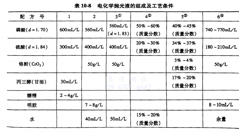 電化學拋光液的組成(cheng)及工藝(yi)條件見表10-8。